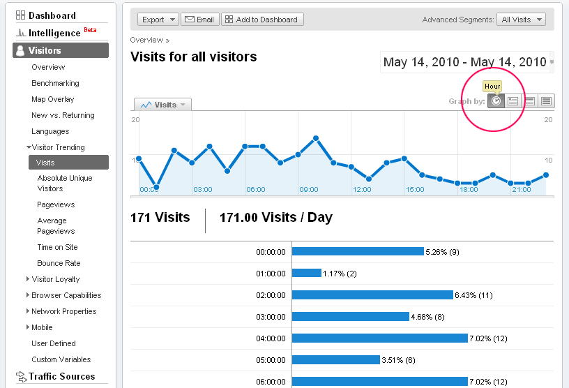 Here is a screen-shot showing visits broken down by hour for May 14: